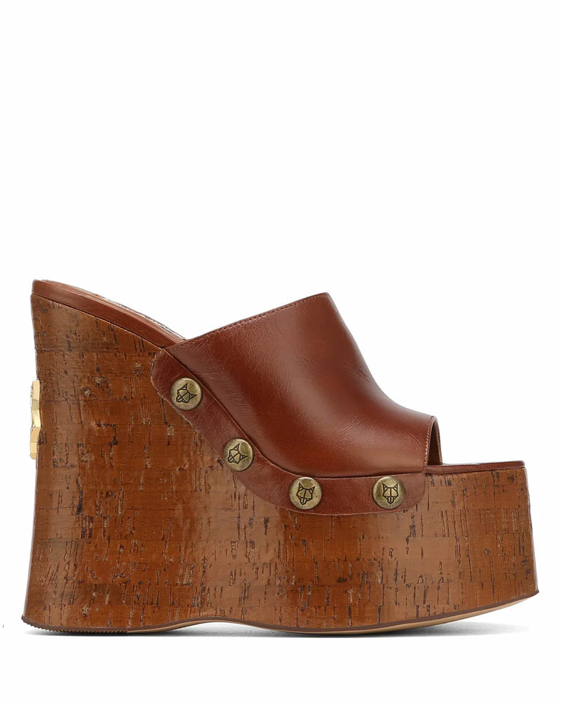 Tulip, our brand new wedged clog heel with a peep toe design is the perfect addition to any summer look. This mule upper is made of top grade luxury Italian leather. The platform is wrapped in a shiny cork wrap featuring the famous wolfe head plaque on the heel.