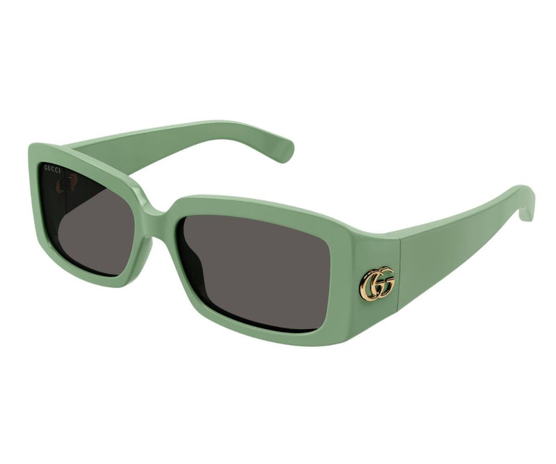 For a modern and feminine look the GG Corner concept is embellished by multifaceted injected construction that makes it unique and timeless. Feminine geometrical rectangular shape in bold acetate. Gucci running logo on the side view. The color palette includes commercial feminine and timeless shades with on top a Sage green sku.
