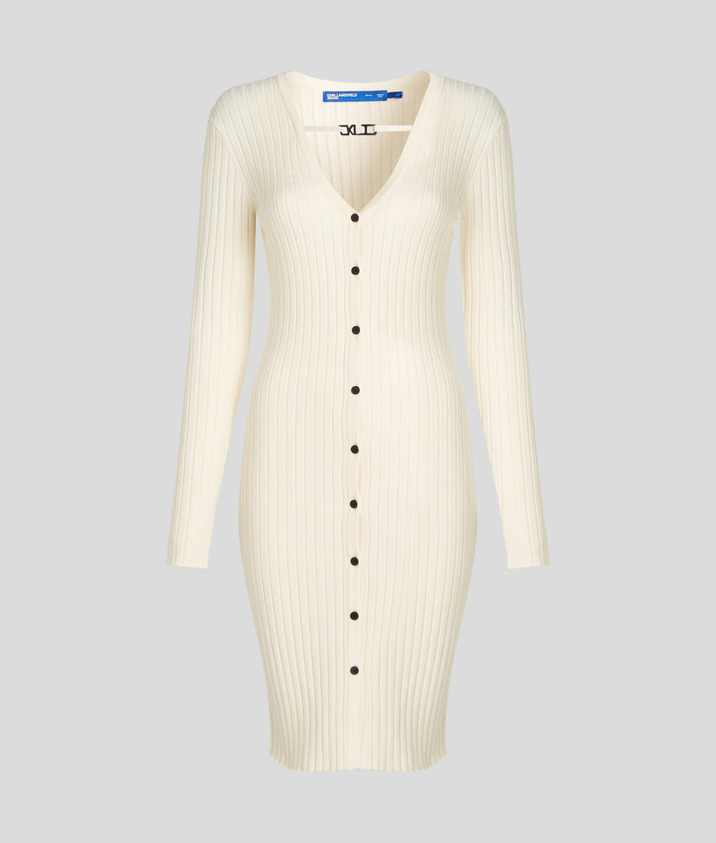Long-sleeved with a figure-skimming silhouette, this rib-knit dress from KARL LAGERFELD JEANS features a button-down closure and a chic V-neckline adorned with a metal KLJ charm.