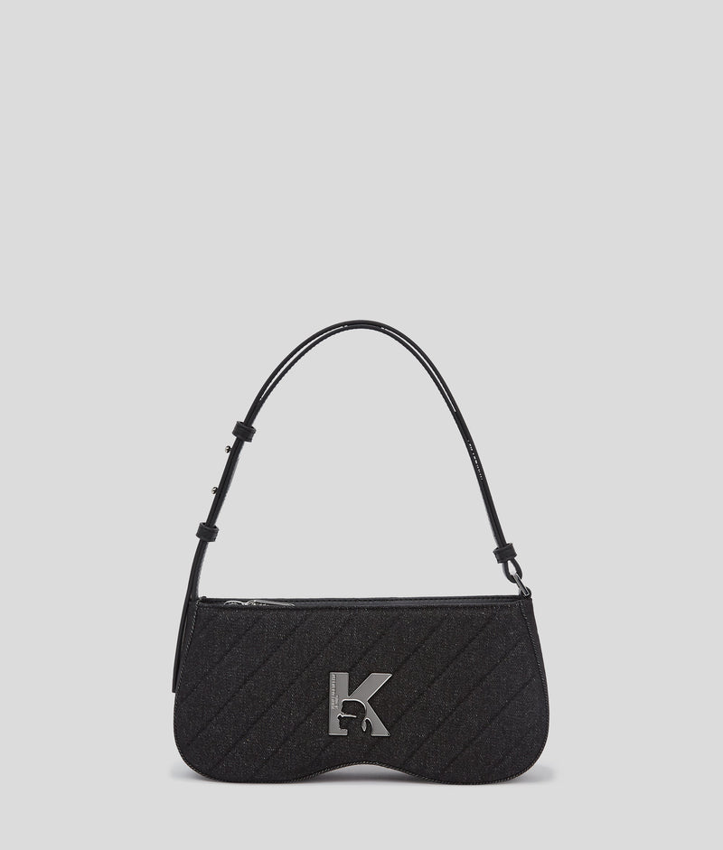 A standout shoulder bag inspired by the iconic aesthetic of the legendary Karl Lagerfeld, it combines an innovative sunglasses silhouette with quilted denim for a truly unique look. Complete with bold K-logo hardware, a zip-top closure, and an adjustable strap for enhanced functionality.
