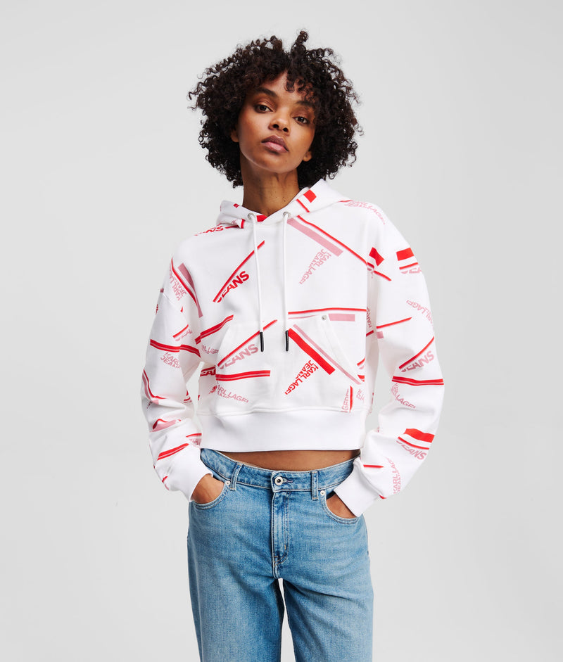 Keep it playful in this cropped hoodie, designed with a laid-back shape that’s perfect for pairing with your favourite jeans. Bold all-over KARL LAGERFELD JEANS artwork and a drawcord hood elevate the attitude, turning casual into a statement.