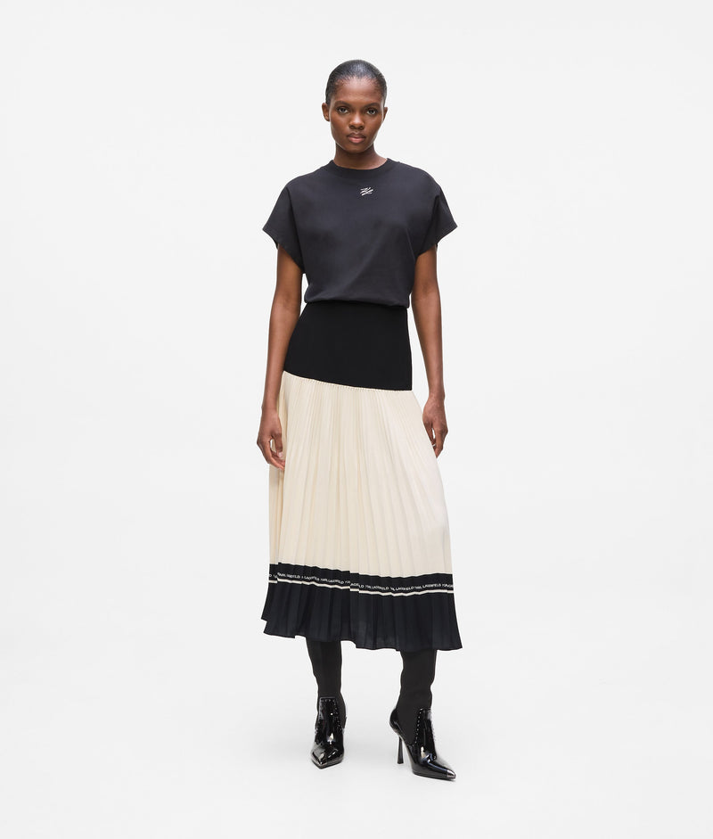 This fluid skirt features a flowing pleated design that moves effortlessly. Bold black accents and a repeating logo add a touch of modern edge to this versatile wardrobe favourite.