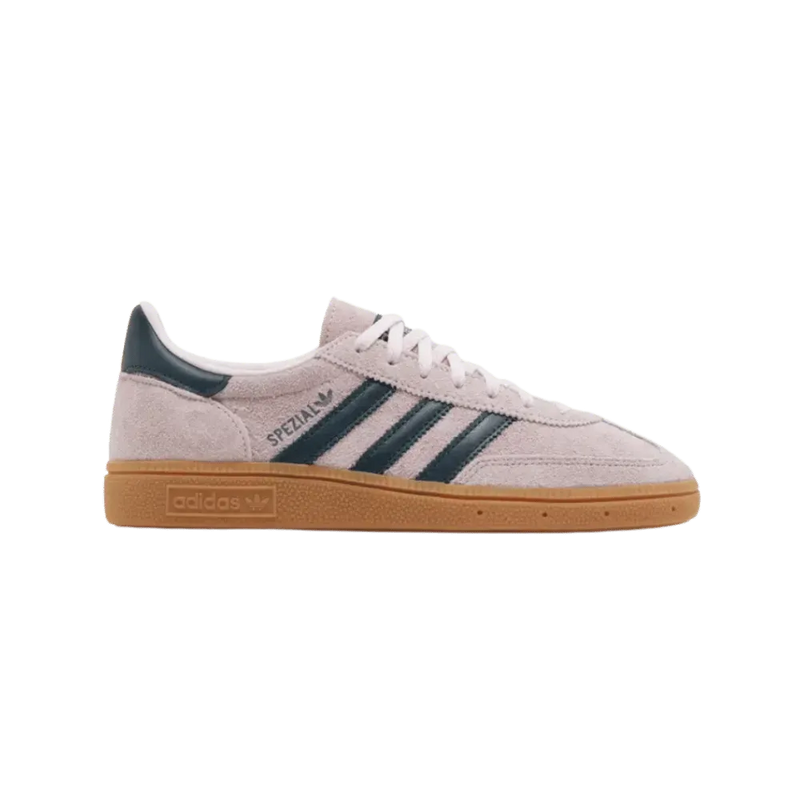 The adidas Handball Spezial 'Clear Pink Arctic Night' (IF6561) blends vintage sport heritage with modern streetwear flair. Its soft clear pink suede upper is accented by deep navy (Arctic Night) leather 3-Stripes and heel tab, creating a subtle yet eye-catching contrast. A classic gum rubber outsole enhances the retro aesthetic while offering durable traction. Designed with a reinforced heel counter and cushioned insole, it ensures stability and comfort for all-day wear. Gold foil 'Spezial' branding and a rounded toe complete the timeless silhouette. This versatile sneaker effortlessly transitions from casual outings to urban adventures.
