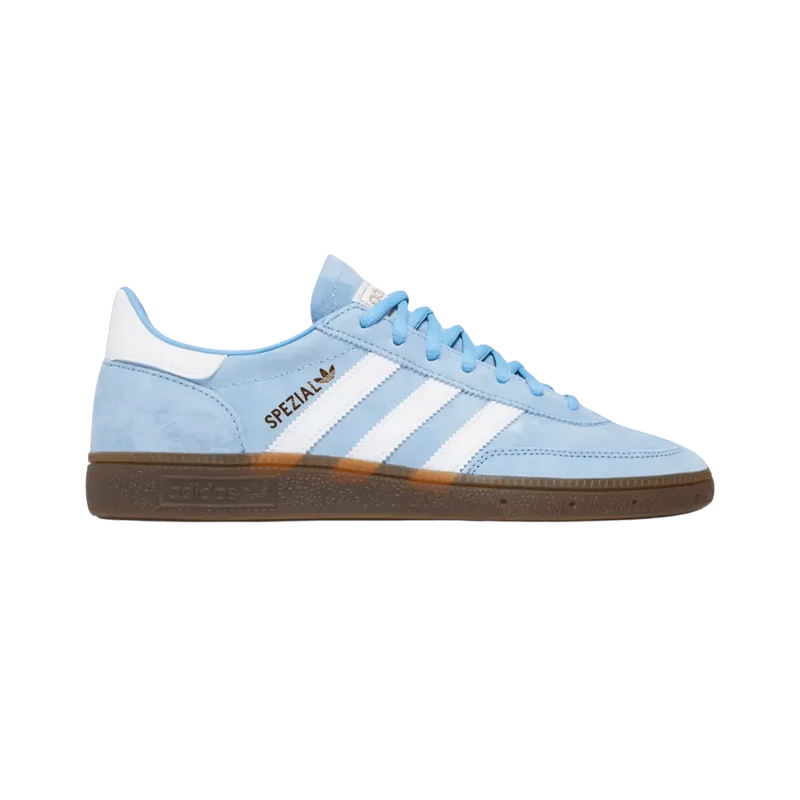 The adidas Handball Spezial 'Light Blue' sneaker is based on a vintage silhouette first released in 1979, and features a low profile upper in a bold blue suede. Hits of white arrive in the form of a branded tongue patch, heel overlay, and Three-Stripes branding. The look is topped off by metallic gold 'Spezial' branding on the side, a T-toe and a rubber outsole.