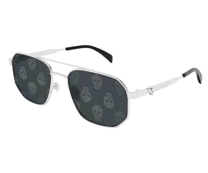 Floating Skull Metal celebrates Alexander McQueen's most iconic symbol with a more subtle touch. Masculine caravan shape in full metal featuring a 3D Metal Skull on the temples. The Alexander McQueen logo is lasered on the temples. The color palette includes silver and gold metal frames paired with lenses in mirrored or solid masculine colors The style includes an exclusive SKU that features mirrored silver pattern lens The endtips are in classic black and tortoise colors.