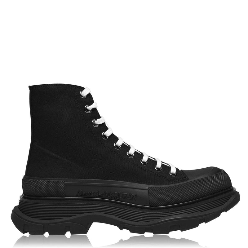 Redefine your trainer collection with these bold Tread SLick High Top Trainers brought to you by Alexander McQueen. These trainers feature an ankle length top trainer with a rounded toe, full lace closure, sturdy tread, a thick ridged rubber sole and Alexander McQueen branding embossed on the sidewall and stitched along the back heel for immediate brand appreciation.
