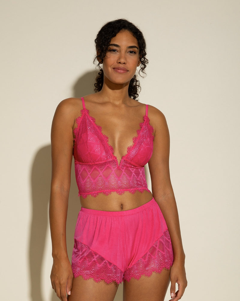 • Cropped, wireless lace bralette-camisole with non-padded cups and dramatic V-wire plunge to enhance shape.