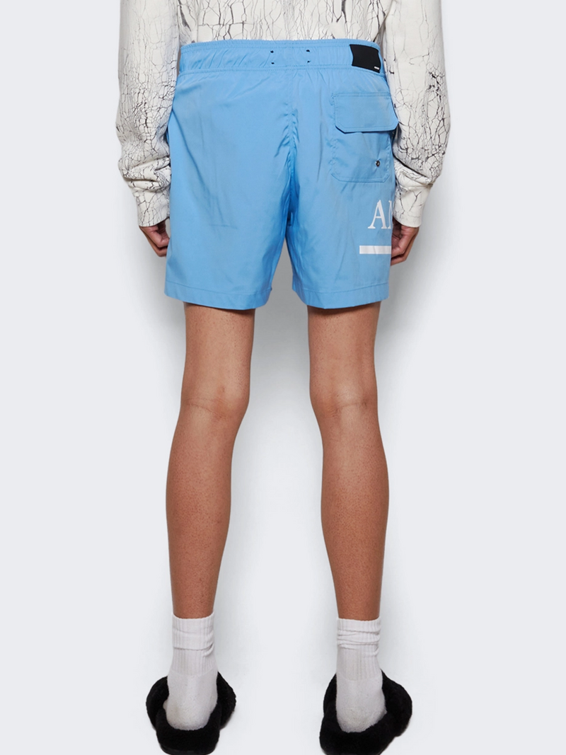 AMIRI M.A. Bar Logo Swim Trunks in Carolina Blue. Crafted for both style and comfort, these swim trunks feature a striking brand logo and a vibrant hue, making them a perfect choice for poolside lounging or beach adventures. The lightweight fabric ensures quick drying, while the elastic waistband provides a comfortable fit. 2 zipped pockets to secure your hotel room key. A must-have for those looking to make a fashion statement this summer.