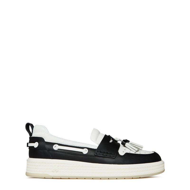 Switch up your Spring/Summer shoe game with the Tassle Loafers by Amiri. These loafers, meticulously crafted from premium calf leather, exude high quality from the very first glance. The panelled design showcases the brand's attention to detail, elevating these loafers to the status of a true fashion statement. With a pull-tab at the heel, slipping into these shoes is effortless, allowing you to embrace a lifestyle of ultimate comfort and elegance.