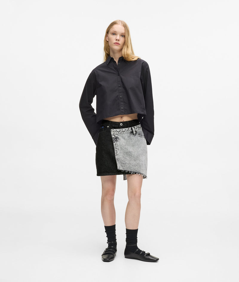 This denim mini skirt breaks the rules with its two-tone, asymmetric design and raw-cut hem. Five-pocket styling and a tonal KARL LAGERFELD JEANS leather patch keep the finishes classic and considered.