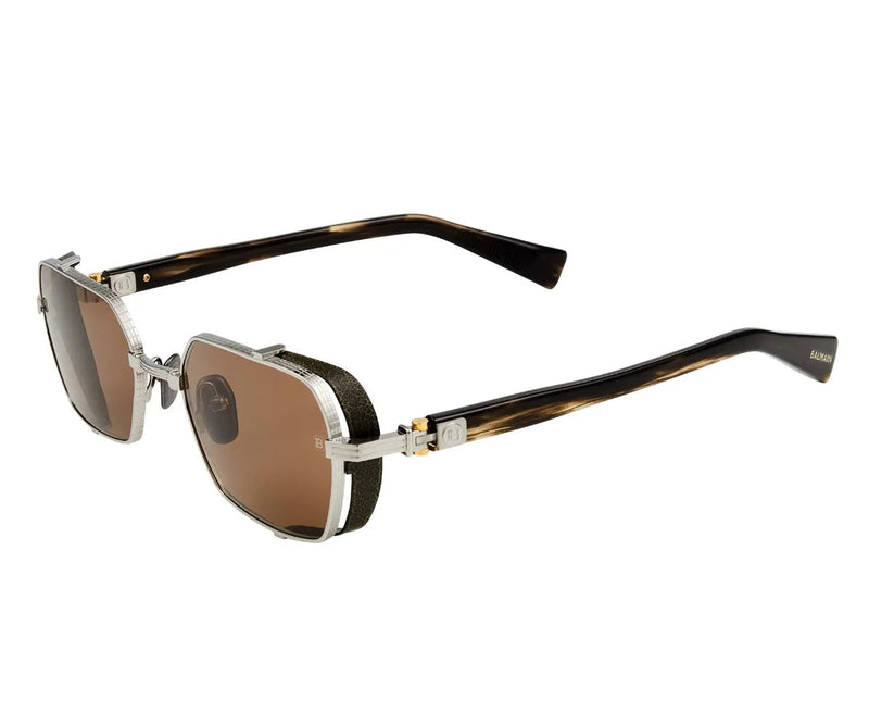The BALMAIN BRIGADE III BPS 117-B sunglasses blend modern luxury with sleek design. Featuring a polished silver frame crafted from premium Japanese titanium, these sunglasses are both durable and lightweight, offering exceptional comfort and style. The solid brown lenses provide a warm contrast to the silver frame while ensuring UV protection for your eyes. With their exclusive style, the BRIGADE III BPS 117-B sunglasses exude elegance and sophistication, making them a must-have for those who value high-end fashion. Perfect for any occasion, these sunglasses will elevate your look, adding a refined touch whether you're at a formal event or enjoying a casual day out.