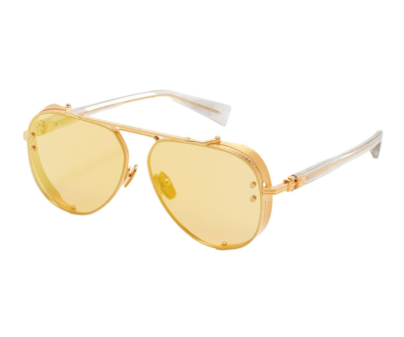 Captaine, Balmain Eyewear’s premiere Aviator style, clearly builds upon the spirit of some of Olivier Rousteing’s most essential collections—those that channel the spirit of bold nomads, daring pilots and intrepid explorers. While it may be riffing on one of the most traditional of frame styles, the Captaine definitely shakes things up a bit by omitting the nose bridge and adding two small golden discs stamped with the Balmain monogram to the oversized lenses. Color choices reflect Balmain’s distinctive DNA, with signature gold, blue and brown tones paired with Japanese acetate. Akoni’s craftsmen have relied on striking tortoise-shell, bone and cracked-leather treatments, allowing each distinct Capitaine option to recall a key Balmain runway moment and helping to make this one of the favorite choices for Balmain’s many celebrity followers.