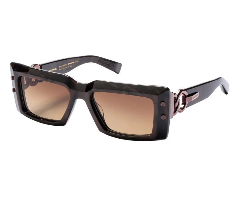 The BALMAIN IMPERIAL BPS 145-F sunglasses are a luxurious statement piece, blending timeless style with modern sophistication. The frame, in an elegant Havana brown, is crafted from premium titanium and acetate, offering a lightweight yet sturdy construction. The solid brown lenses not only enhance the refined aesthetic but also provide full UV protection, ensuring comfort and safety in the sun. With an exclusive design and meticulous craftsmanship, these sunglasses are ideal for individuals who appreciate luxury and bold style. The combination of high-quality materials and sleek design makes the BALMAIN IMPERIAL sunglasses a perfect choice for those seeking eyewear that reflects both fashion and function in equal measure.