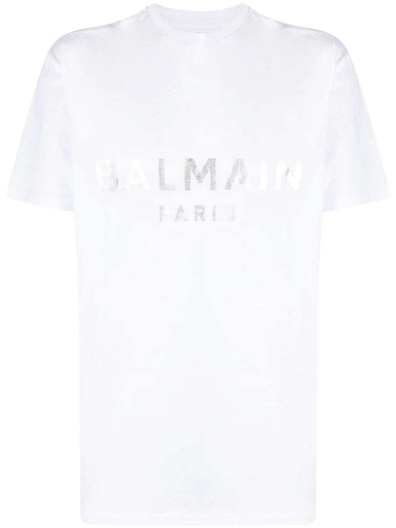 Logo-print detail T-shirt from Balmain featuring cloud white, cotton, logo print to the front, round neck, short sleeves and straight hem.
