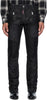 Coated stretch denim jeans. Subtle distressing and fading throughout.