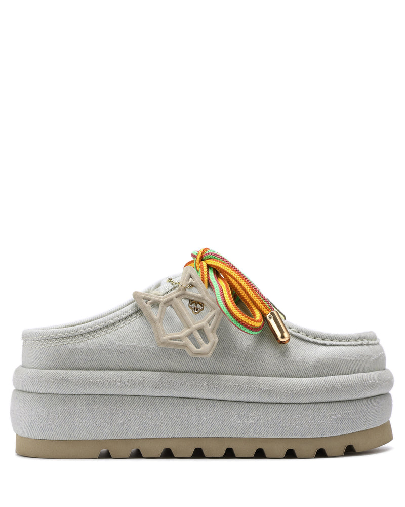 Introducing the Blizzard slip-on from Naked Wolfe, a backless shoe that combines luxury and modern comfort. Crafted from high quality distressed denim, it features a high quality leather lining and a leather sock for exceptional comfort. The shoe boasts a 60mm heel height and a chunky super light tread for an elevated look. Thick multi coloured laces, with an embossed logo and a big Wolfe head key chain enhance its distinctive design. Perfect for making a statement, the Blizzard slip-on is a must-have addition to your footwear collection.