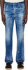 ndigo-dyed stretch denim jeans. Whiskering, fading, and bleach splatters throughout.