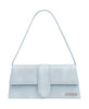 Elevate your style with this Jacquemus shoulder bag in light blue embossed lizard leather. The Le Bambino Long Bag features a sleek design with dimensions of 28 cm x 13.5 cm, perfect for the modern woman.