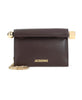 Elevate your look with this JACQUEMUS clutch in dark brown leather, featuring a unique folded design, magnetic closure, and interior card pocket. Dimensions: W:19cm, H:13cm, D:6cm. A stylish accessory for any outfit.