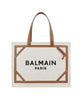 Elevate your style with the Balmain B-Army Medium Shoulder Bag, a luxurious and functional accessory designed for the modern woman. Featuring flat top leather handles, a top hook closure, and an embroidered iconic brand monogram, this tote bag is both stylish and practical. The spacious single compartment and interior pouch offer convenient organization. Crafted with cotton fabric and leather details, this bag is a chic addition to any outfit.