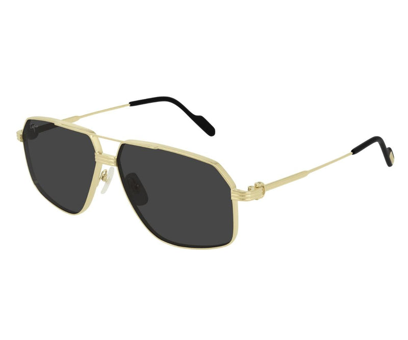 Masculine navigator shape in a new bolder construction for a vintage appeal. Iconic combination of the Godron and the C de Cartier as aesthetical and functional element of the hinge. Prèmiere dedicated Zaiss colourful lenses with light gold flash effect and red anti-reflective coating. Cartier logo lasered on metal temple tips and Double C Décor signature on the nose pads.