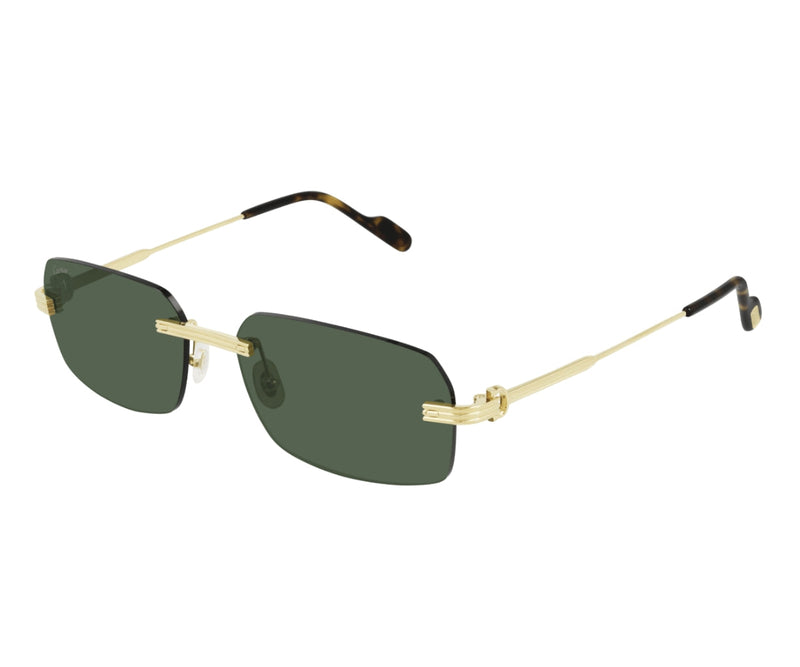 Contemporary rectangular rimless shape with the Première bold metal aesthetic. Iconic temples enriched with the C de Cartier and Godron detail being both an aesthetic and functional element of the hinge. Première dedicated Zaiss colourful lenses with red anti-reflective coating. Cartier logo tag on the acetate temple tips and precious finish in gold or platinum.