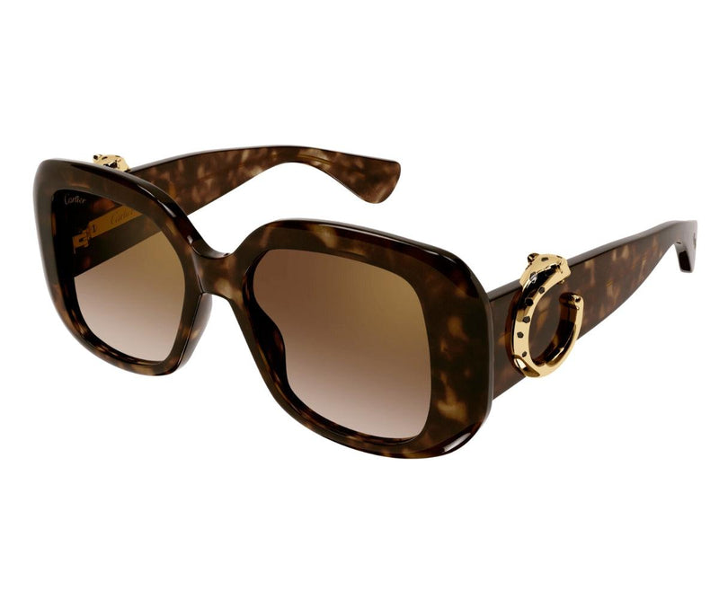 New ultra-feminine acetate construction inspired by the leather goods collection with the three-dimensional Panthère C embellishing the temple. Classic and sophisticated oversize squared shape perfect for an elegant and charming look. Iconic Panthère C detail decorated with hand-made enamel spots played as a jewelry signature on the temples. Precious finish in gold and dedicated acetate colour in synergy with the leather goods collection.