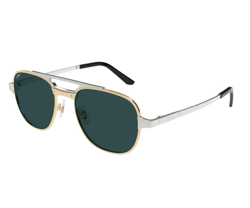 Experience timeless sophistication with the Cartier 0477S 003 sunglasses. Featuring a sleek navigator design, these frames combine luxurious gold and silver tones, showcasing Cartier's unparalleled craftsmanship. The solid green lenses offer essential UV protection, ensuring both style and practicality. Made from premium metal, these sunglasses are lightweight yet durable, perfect for all-day wear. With their exclusive and refined aesthetic, the 0477S 003 model is a standout accessory for those who value elegance and high-end design. Ideal for making a statement in any setting, these Cartier sunglasses are the epitome of luxury eyewear.