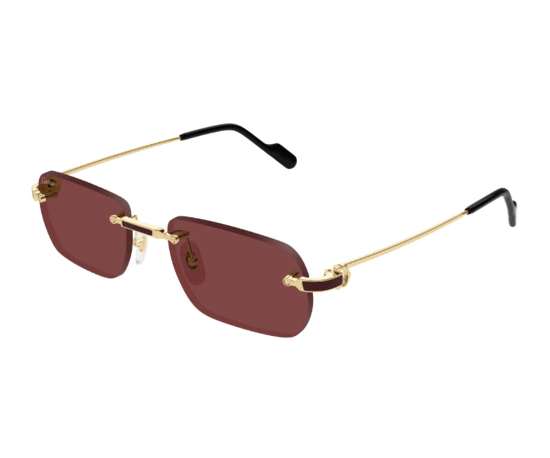 Cartier sunglasses model 0498S 002 are a striking blend of bold elegance and timeless design. Featuring a sleek gold metal frame in a refined rectangular shape, these sunglasses stand out with their vibrant solid red lenses, offering both visual impact and essential UV protection. The luxurious finish and minimalist silhouette highlight Cartier’s dedication to quality and craftsmanship. Lightweight and comfortable, they are perfect for those who appreciate statement accessories with a touch of exclusivity. The contrast between the warm gold frame and deep red lenses creates a distinctive, fashion-forward look. Designed for individuals who value refined luxury and expressive style, this pair is a standout choice for any sophisticated wardrobe.