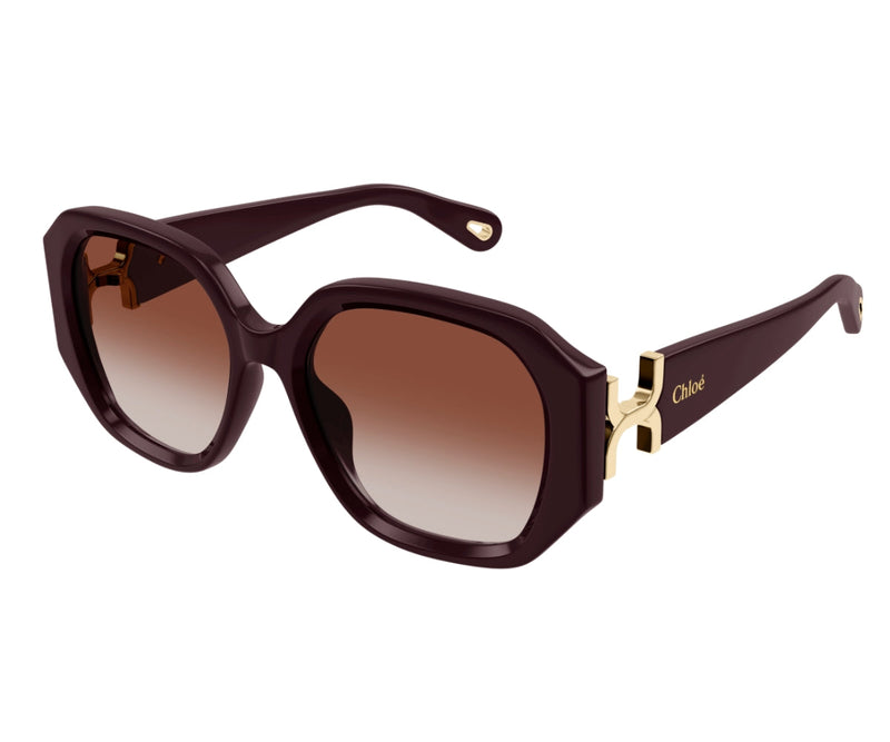 Oversize soft square frame in acetate. Marcie gold metal logo as a functional hinge. Solid colors inspired from Chloé SS24 RTW collection.