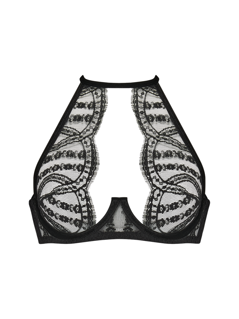 Jet black Leaver's Lace meets sumptuous black velvet in an emboldening halterneck shape. The wired bust and gentle structure glides down the décolletage and around the body to give a sleek silhouette and inimitable impact.