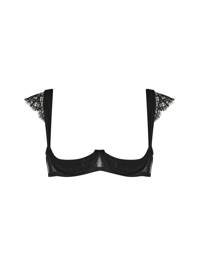 Jet black velvet-covered crescents add lift and support to the décolletage, whilst leaving the nipples uncovered in a playfully erotic style. Inspired by a Baroque silhouette, this piece is enhanced by the romance of the scalloped caps of Leaver's Lace and velvet straps, framing the chest so beautifully.