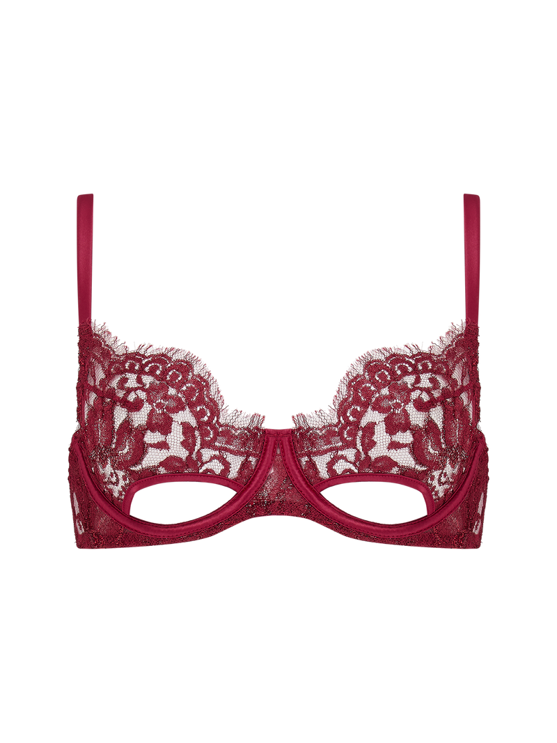 Crafted in a rich burgundy lurex Leaver's lace, heightened by the romance of the floral pattern, timeless scallops and eyelash finish, the Naraya Balcony Bra gives a natural lift, the silk bound wiring giving a soft structure and the delightful cut out detail adding drama.