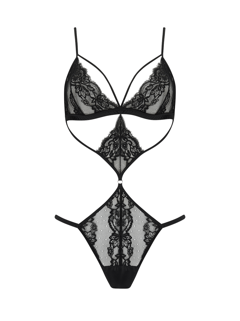 Rouleau straps weave panels of jet black French Leaver’s lace  across the body, enticing both sight and touch across the skin with a wonderfully flattering design across your curves.