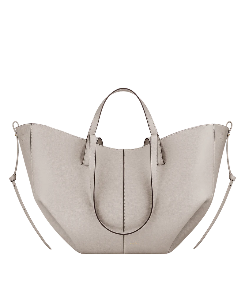 This sculptured tote bag featuring waves, folds, and curves can be used in two ways. Basket-style, with its sides open and straps on the outside, or As a flower-like closed bag, with its sides tucked in and its straps crossed on the inside.