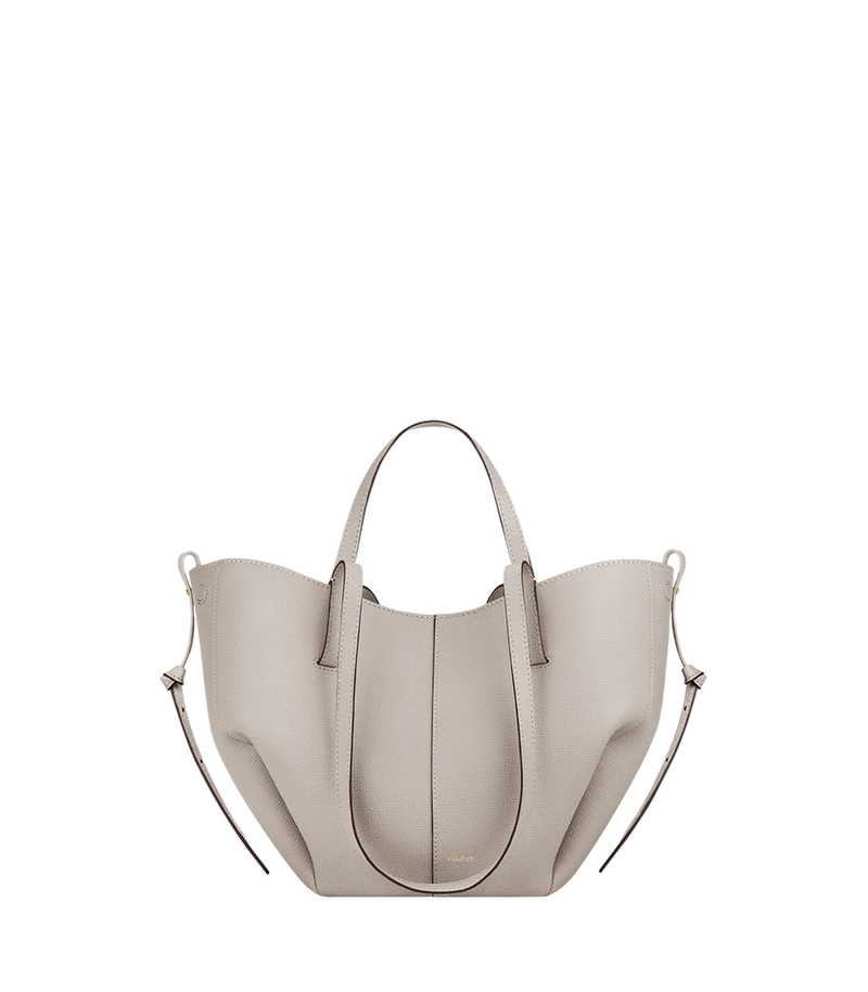 This sculptured compact tote bag featuring waves, folds, and curves can be used in two ways. Basket-style, with its sides open and straps on the outside, or As a flower-like closed bag, with its sides tucked in and its straps crossed on the inside.