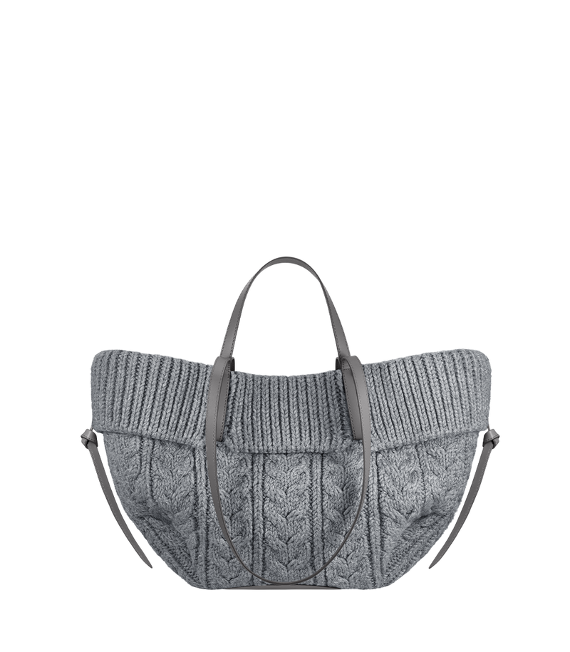 This compact sculptured tote bag featuring waves, folds, and curves can be used in two ways. The first is a basket, its sides open, its straps on the outside. The second is a floral, closed bag, its sides tucked in, its straps crossing on the inside. Its name was inspired by the French word “cime”, meaning a peak or mountain crest, in reference to the ridge running along it.