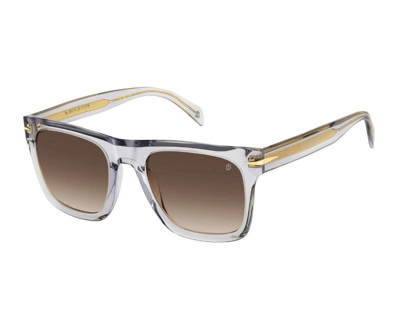 David Beckham sunglasses model DB 7000/S FLAT color code 63M HA crystal grey. The recognizable and seductive style of Eyewear by David Beckham is embodied in these iconic sunglasses, which are anything but ordinary. The bold acetate frame is characterized by notable yet flat volumes, which ensure a lightweight fit. The temples, which also come in a clear version with a visible wire core, are trimmed by the brand’s metal symbol and, on the inside, the full "by David Beckham" signature.