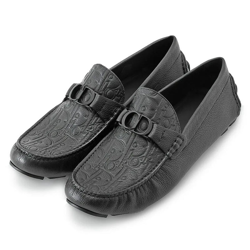 The Dior CD Monogram Embossed Leather Loafers in black combine iconic branding with refined craftsmanship. Designed in grained leather with a full monogram-embossed upper, this loafer features a tonal CD clasp across the strap for a sleek and modern finish.