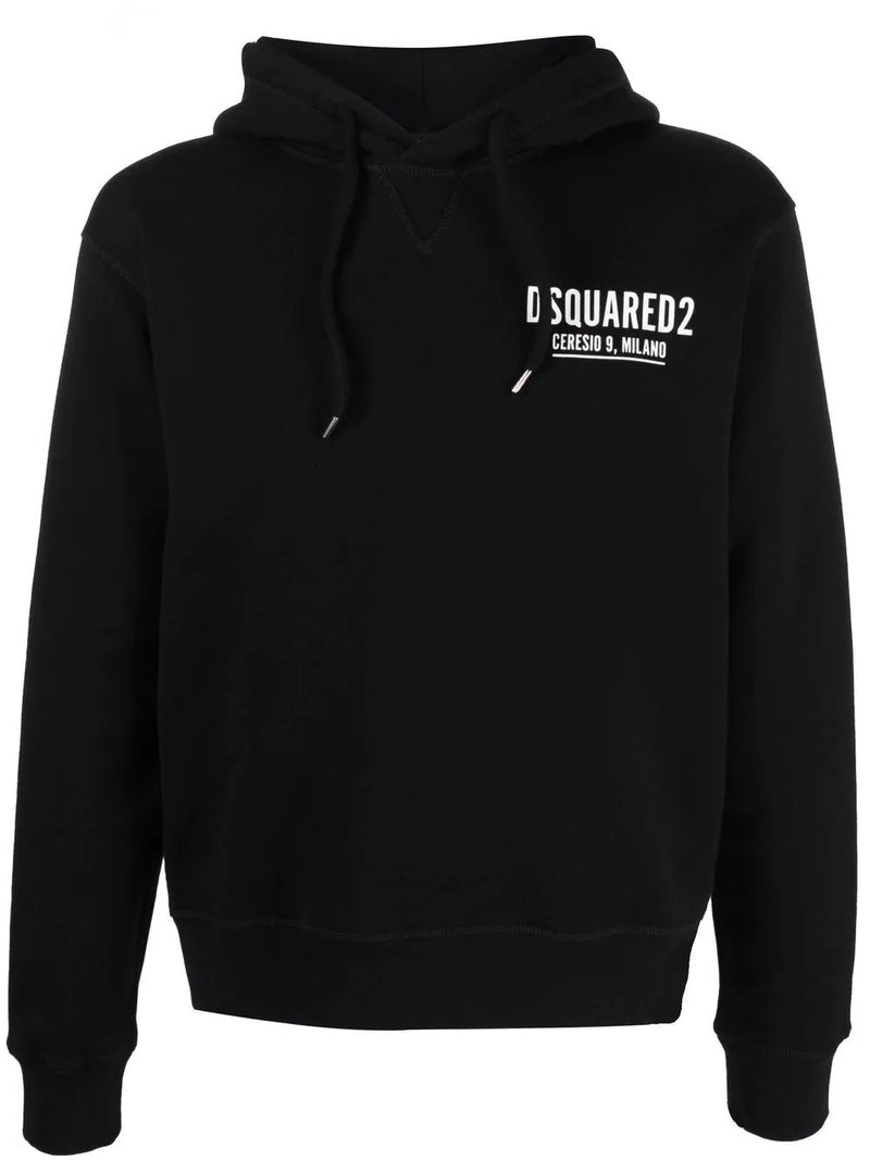 Black cotton logo-print cotton hoodie from DSQUARED2 featuring logo print to the front, drawstring hood, long sleeves, ribbed hem and ribbed cuffs.