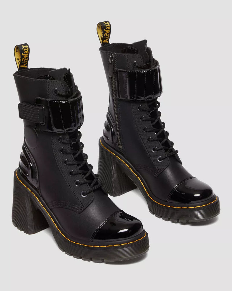 Step up. Stand out. This 10-eye boot is inspired by classic biker footwear — for a different way to do heels. Built with exaggerated, mixed-leather construction on a statement, chunky flared heel. Fitted with a moulded soft Patent PU leather heel counter, toecap, and ankle strap. Detailed with an archive-inspired DM’s branded tongue patch. The sole is secured with our signature yellow welt stitching, and the top of the boot is tagged with a black and yellow heel loop.
