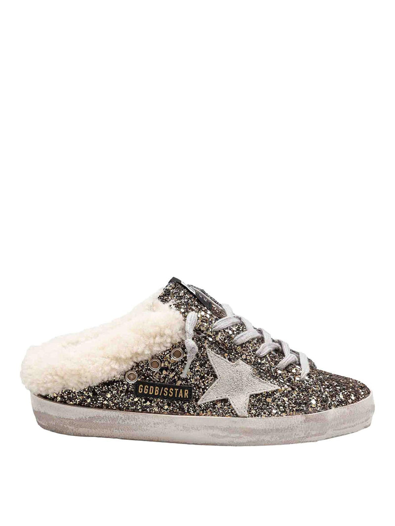 Add a touch of sparkle and warmth to your casual wardrobe with the Golden Goose Glitter and Fur Sneakers. These dazzling sneakers are covered in glittering gold and silver tones, with the brand’s signature star in white. The cozy faux fur lining ensures your feet stay warm and stylish, while the rubber sole features the signature distressed finish for that unmistakable Golden Goose look. Perfect for adding a bit of luxe and comfort to your laid-back outfits, these sneakers offer both style and functionality.