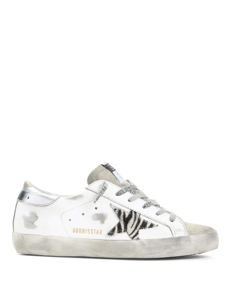 The Golden Goose Zebra Print Star Sneakers effortlessly blend animal print with luxury streetwear. Made from white leather, these sneakers are adorned with a striking zebra-print star, offering an eye-catching contrast to the clean white base. Metallic silver accents on the heel and tongue elevate the design, while the signature distressed sole maintains the brand's vintage-inspired charm. With suede detailing and signature Golden Goose branding, these sneakers deliver bold style and comfort in one versatile package.