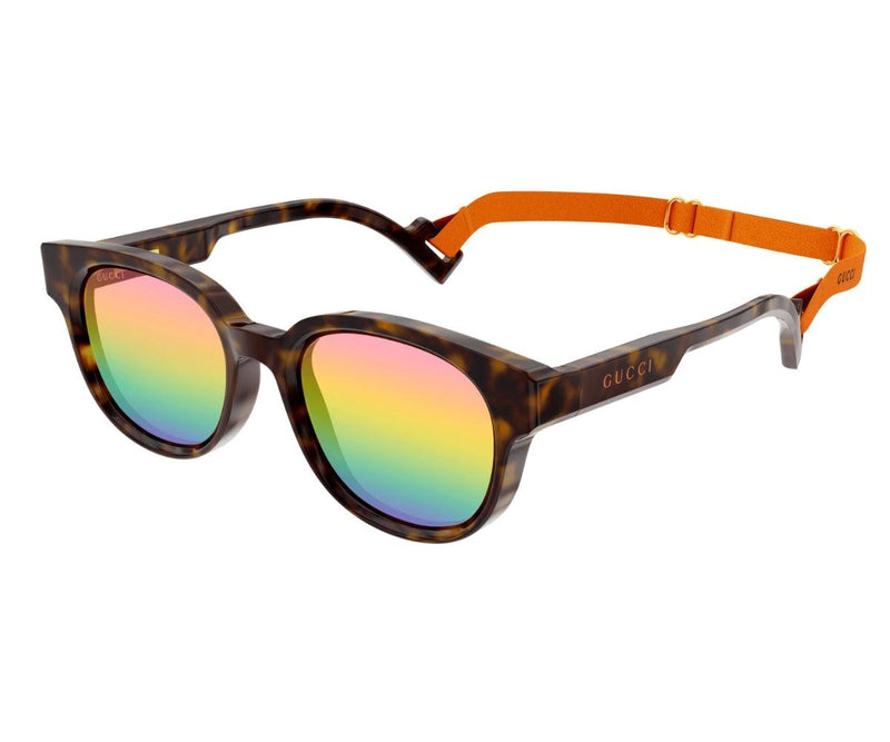 Sporty and vintage inspired this squared style is made in full plastic with the Gucci lettering logo on both temples with a dedicated G cut out temple tip to attach the exclusive lanyard with the Gucci lettering logo written on it. The style come with a well-balanced color proposal: from classic to sporty with mirror lenses for the more image driven SKUS