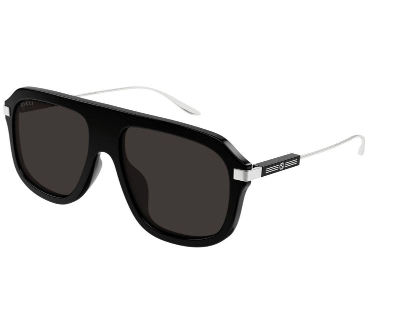 Timeless piece for every gentleman's wardrobe. Pilot shape with acetate front and metal temples. GG interlocking logo enriched by enameled web detail on the metal temple. The available palette includes shiny gold and silver galvanic paired with masculine colored acetates.