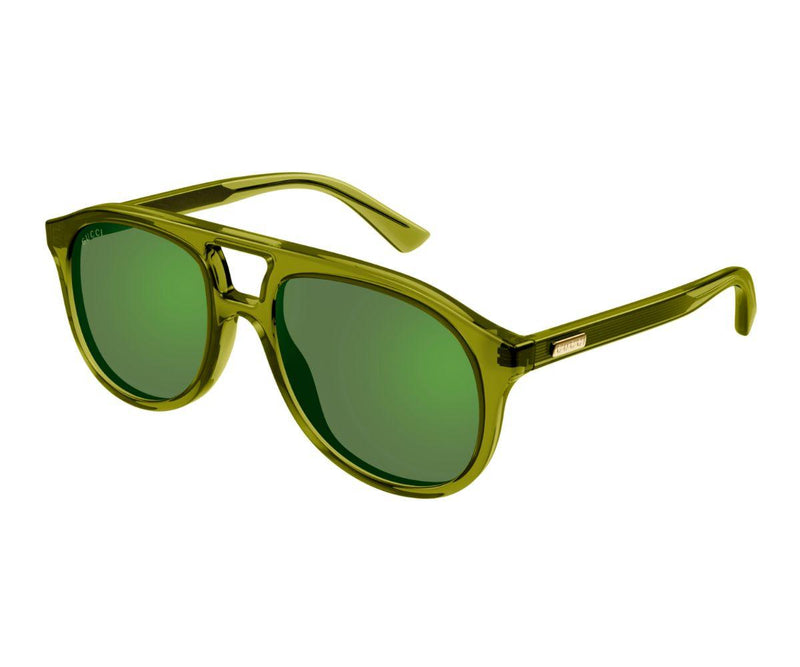 Pilot shape. Gucci lettering logo on temples. Summerish colour palette with a balance between transparent & solid colour. Concept inspired by the youthful and alternative atmosphere of Carnaby Street, London, in the 60's.