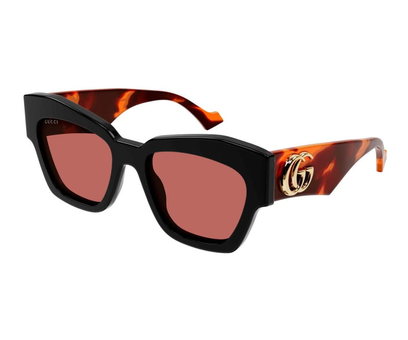 Pared-back simplicity characterizes the essential shapes, lines and colours of this concept, for a cool and on-trend mood. Inspired by a gender fluid look, translated in a street style effortless look. Squared Cat-eye shape in bold acetate for an extremely feminine look. Gucci running logo embellishes the bold temples.