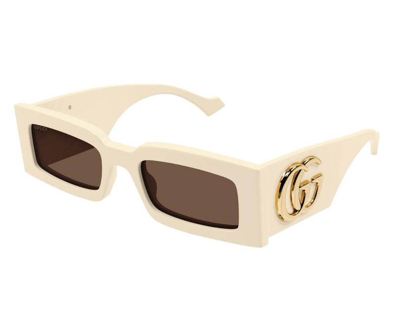 Pared-back simplicity characterizes the essential shapes, lines and colours of this concept, for a cool and on-trend mood. Inspired by a gender fluid look, translated in a street style effortless look. Rectangular shape in bold acetate with a bold temple construction conceived for an extra-feminine yet fashionable look. Gucci running logo embellishes the bold temples. The extravagant color palette is characterized by 2 skus in commercial colors and 2 fashionable skus such as a green havana and a ivory tone. Completes the assortment a full strassed sku.