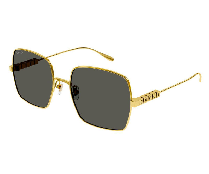 Through simple yet iconic metal cubes, the Lettering concept highlight the Gucci logo in a never seen recogniseable construction. Feminine squared shape in metal. The Gucci lettering is enameled on distinctive metal cubes. The color palette is made of a gold metal structure paired with both commercial yet colored lenses.