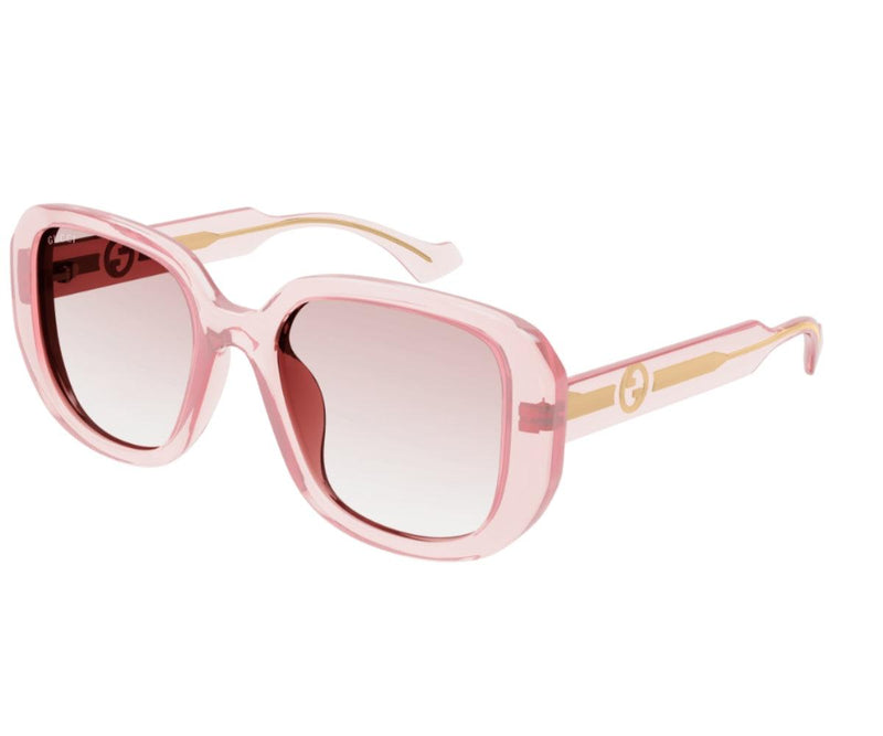 Summerish, fresh and color are the key distinctive features of this story. Oversized shape with consistent thicknesses and transparent and brilliant plastics. Oversize squared acetate shape. Blondie Gucci logo floats into the temple construction.